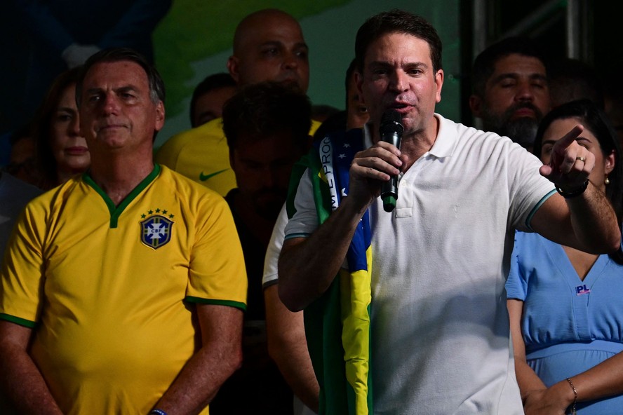 Jair Bolsonaro e Alexandre Ramagem em lançamento de pré-candidatura à prefeitura do Rio — Foto: Pablo PORCIUNCULA / AFP