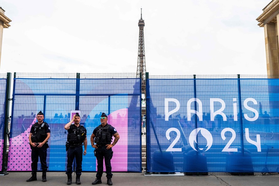 Seguranças na área do Trocadero e perto da Torre Eiffel: local com competições — Foto: Jewel SAMAD / AFP