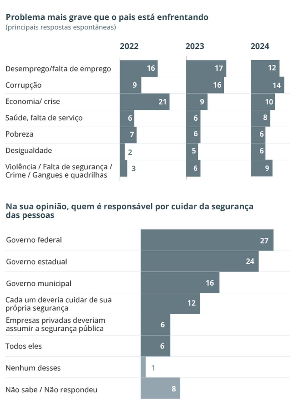 Os dados da nova pesquisa também sugerem um avanço da agenda da segurança pública na agenda pública. Questionados sobre o “problema mais grave do país”,um total de 9% dos entrevistados cita quatro alternativas ligadas à área: “violência”,“falta de segurança”,“crime” e “gangues e quadrilhas”. Em 2022,elas somavam 3%.