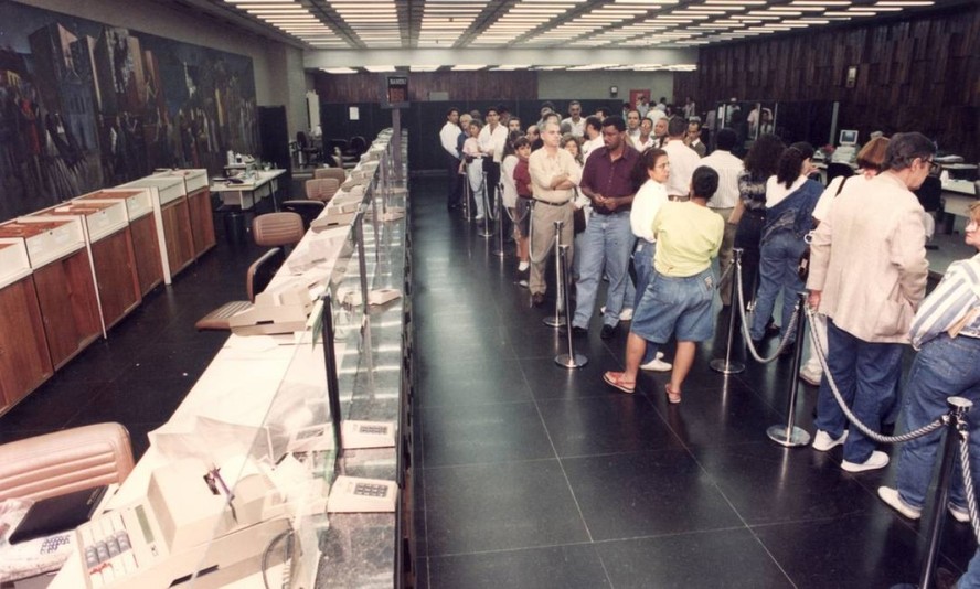 Filas para trocas as cédulas antigas por Real,em julho de 1994 — Foto: Júlio César Guimarães / Arquivo - 01/07/1994