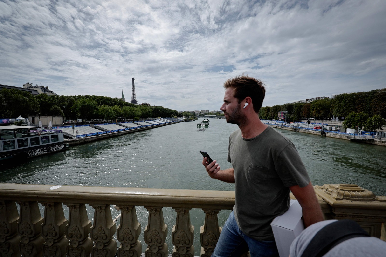 Mulher observa preparação do Rio Sena para abertura de Paris-2024 — Foto: AFP
