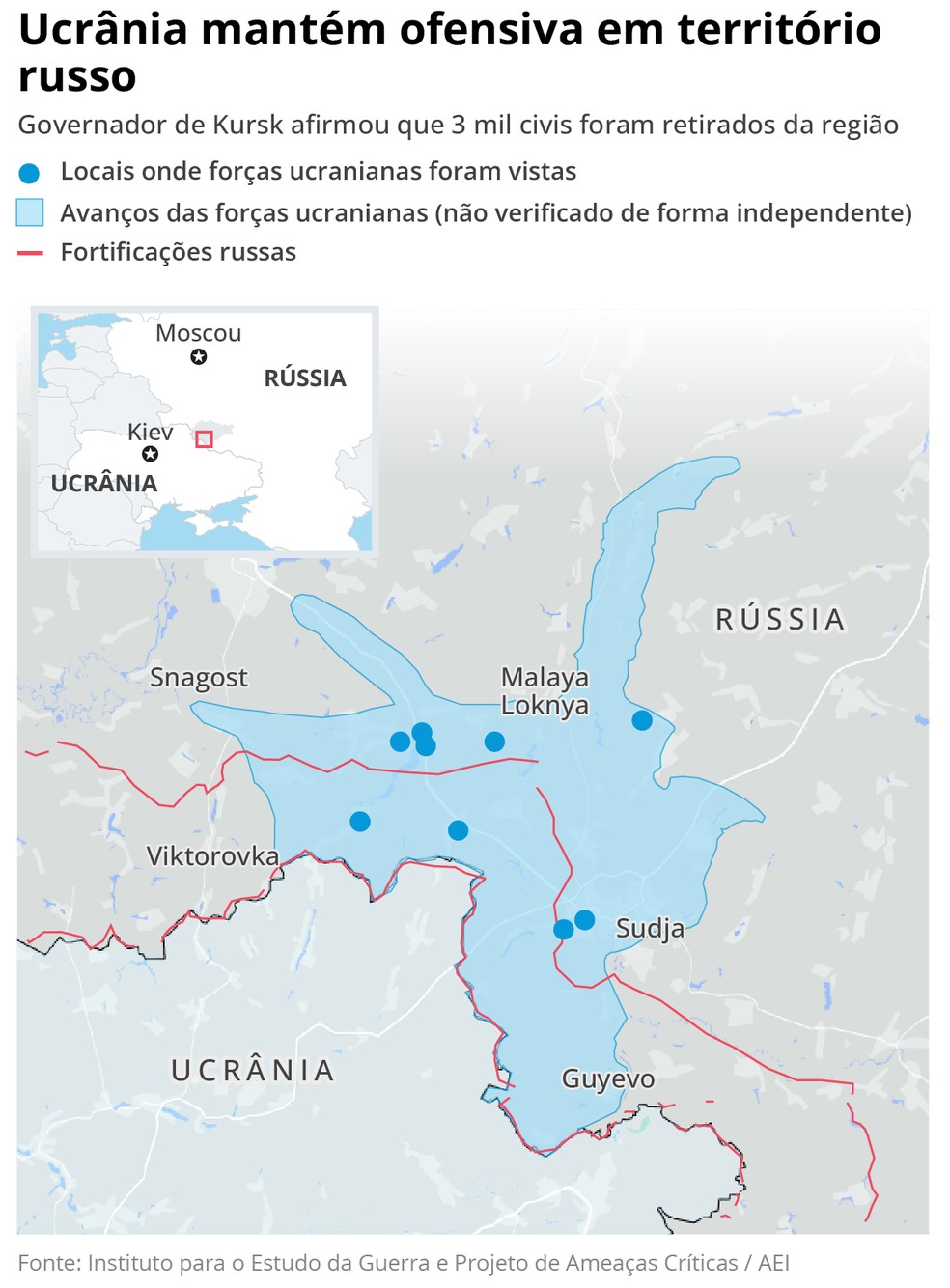 Quatro dias depois da invasão ucraniana da região russa de Kursk,onde estão uma importante estação de transporte de gás natural para a Europa e uma central nuclear,as forças de Moscou ainda tentam entender o que aconteceu e como expulsar os militares de Kiev de seu território. O ataque foi um dos episódios mais surpreendentes desses dois anos e meio de conflito,e sinaliza que a Ucrânia pode mudar suas ações no front,e que precisa de mais armas ocidentais para isso.