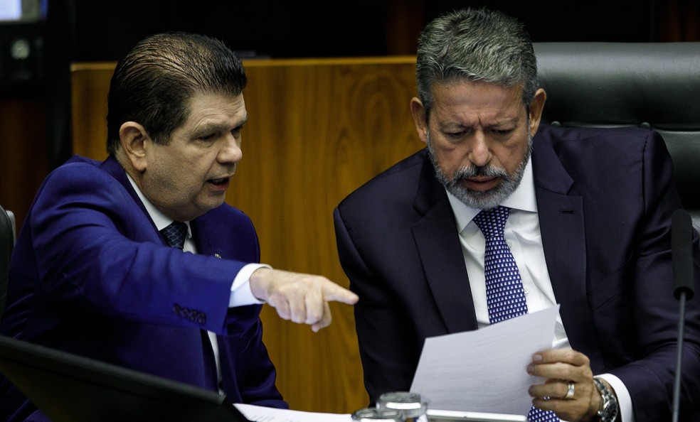 Deputado Mauro Benevides Filho (PDT-CE),relator desta regulamentação da reforma,conversa com o presidente da Câmara,Arthur Lira (PP-AL) — Foto: Brenno Carvalho / Agência O Globo