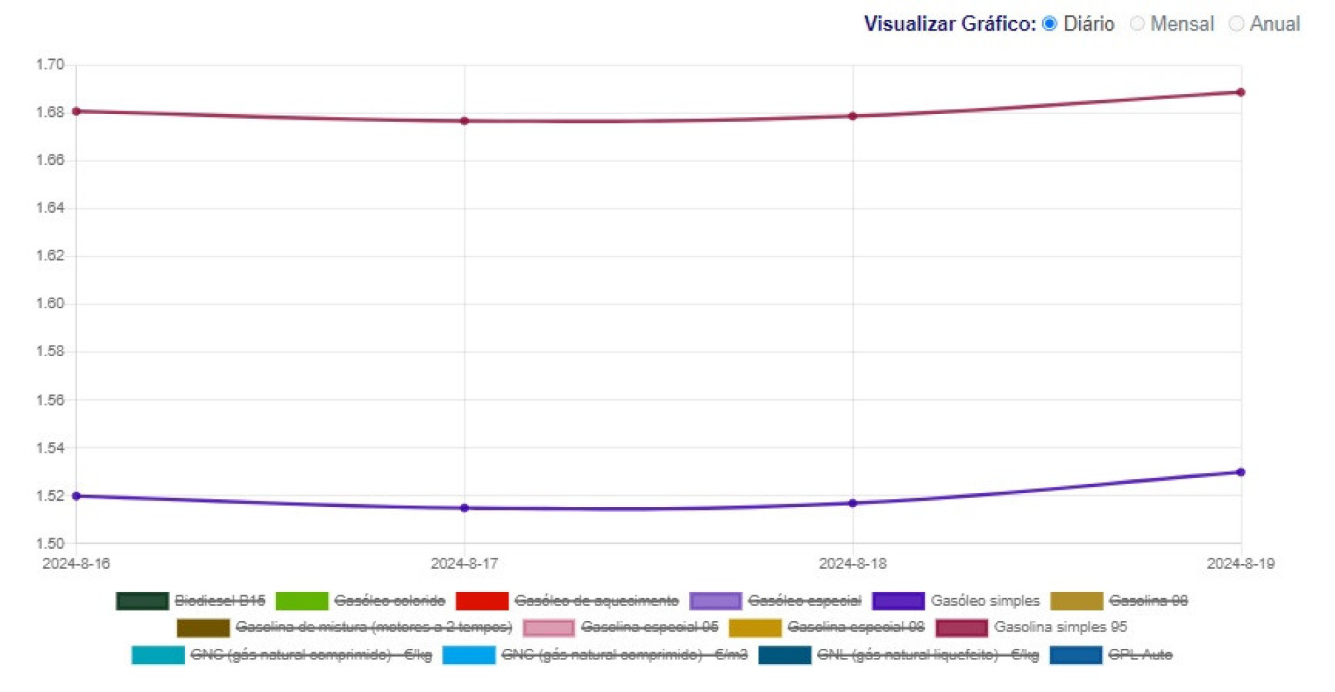 Evolução do preço da gasolina simples 95 (a vermelho) e do gasóleo simples (a azul)© Reprodução do site da DGEG
