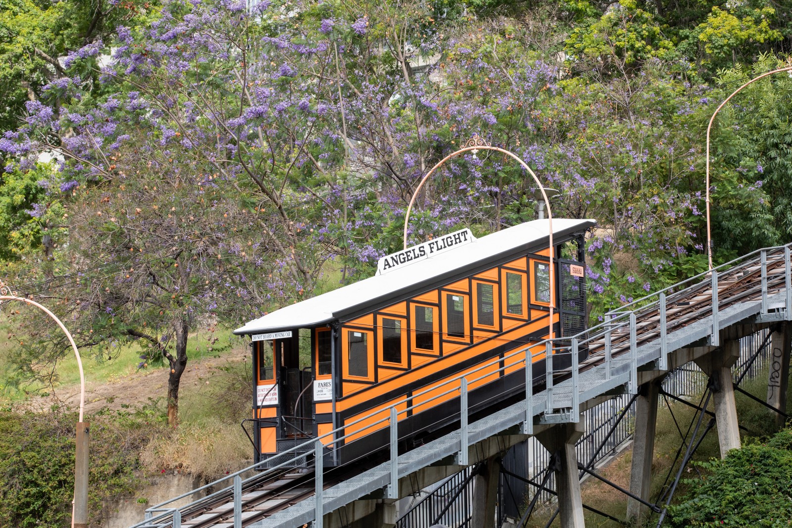 O funicular Angels Flight,construído em 1901 e ainda em operação em Downtown Los Angeles,é uma das atrações na cidade acessíveis pela rede de metrô — Foto: Beth Coller/The New York Times