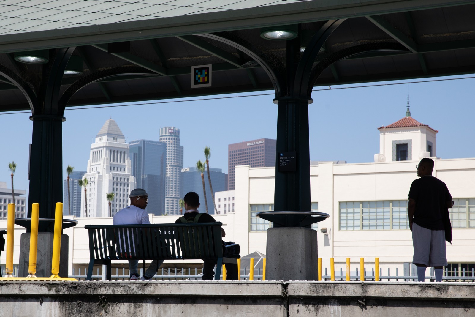 Passageiros esperam pelo trem da Linha A do metrô na Union Station,o principal hub ferroviário de Los Angeles — Foto: Beth Coller/The New York Times