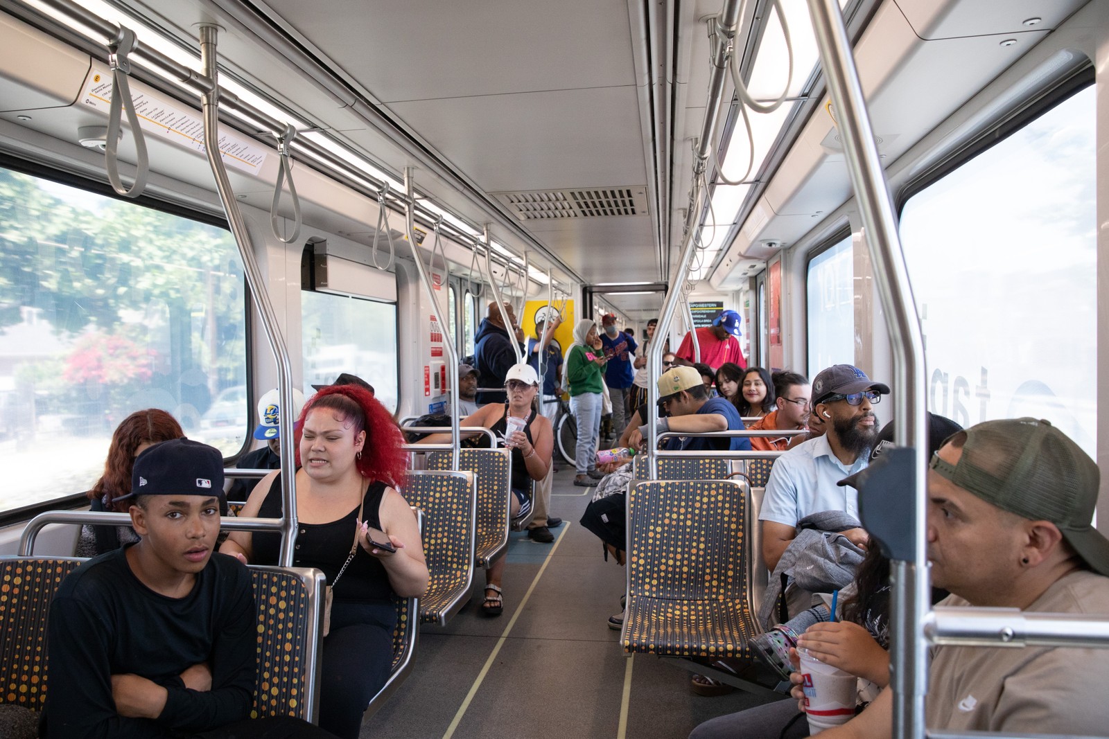 Passageiros no vagão de uma das composições da Linha E do metrô de Los Angeles: rede tem se expandido bastante nos últimos anos,de olho nas Olimpíadas de 2028 — Foto: Beth Coller/The New York Times