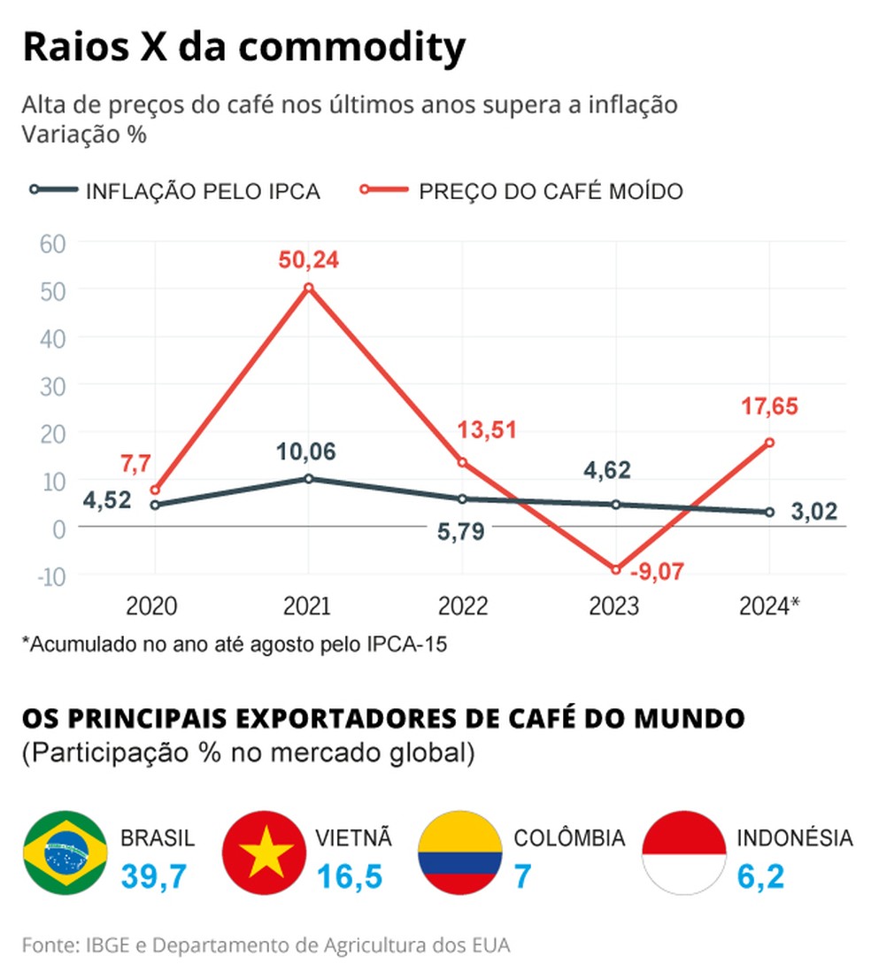 Para o consumidor,só este ano,o preço do pó de café até agosto teve alta de 17,65%,bem acima da inflação do período de 3,02%. Com isso,mesmo considerando que em 2023 houve queda nos preços,o café quase dobrou de preço (90%) desde o início de 2020.