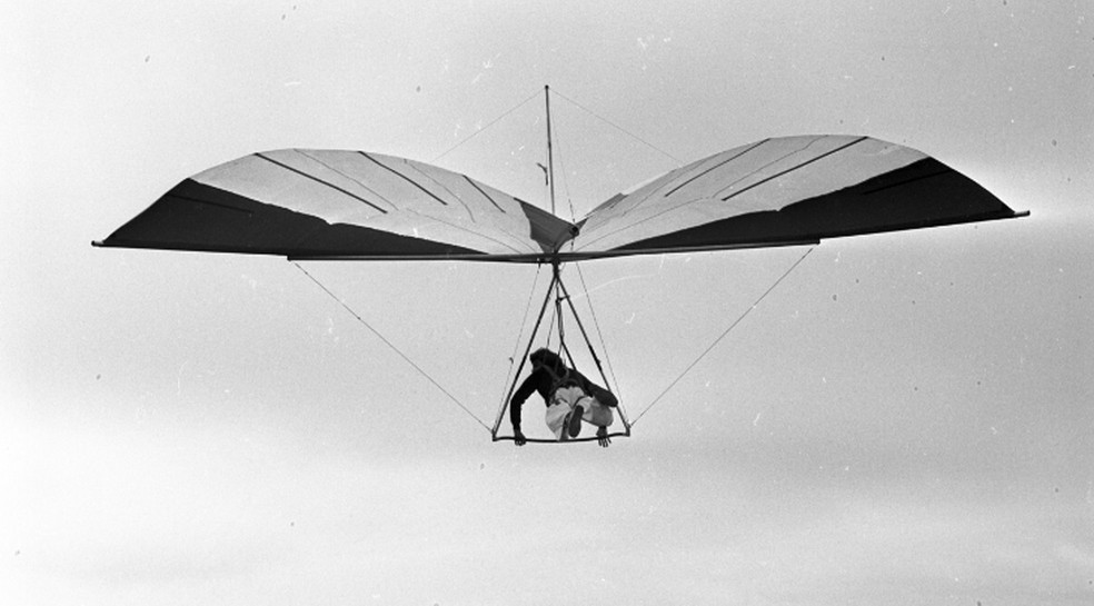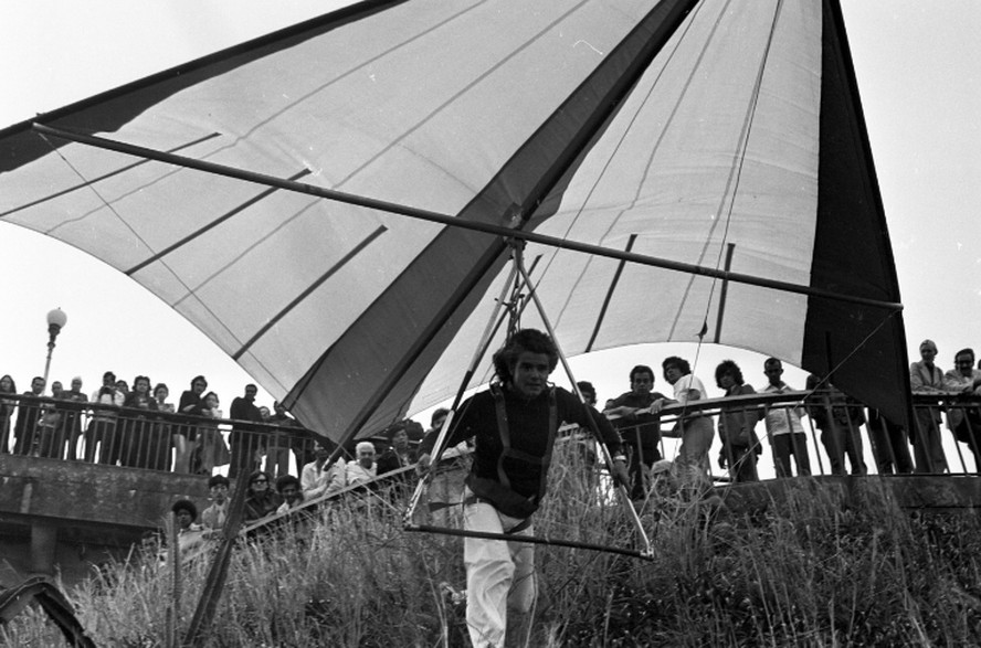 'Homem-pipa': o voo inaugural da asa-delta em 12 de setembro de 1974 — Foto: Sebastião Marinho/Agência O GLOBO