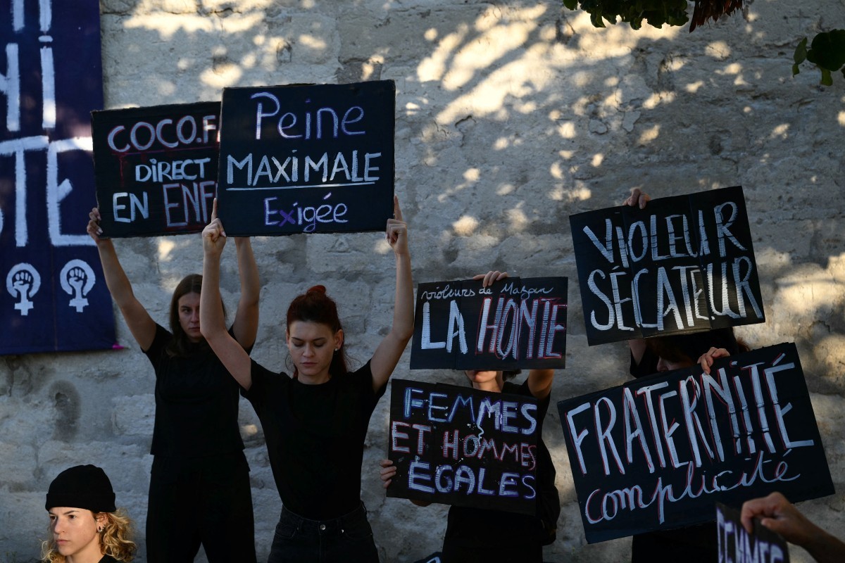 Manifestantes seguram cartazes durante um protesto do lado de fora do tribunal durante o julgamento de homem acusado de drogar sua esposa por quase dez anos e convidar estranhos para estuprá-la,na França — Foto: AFP