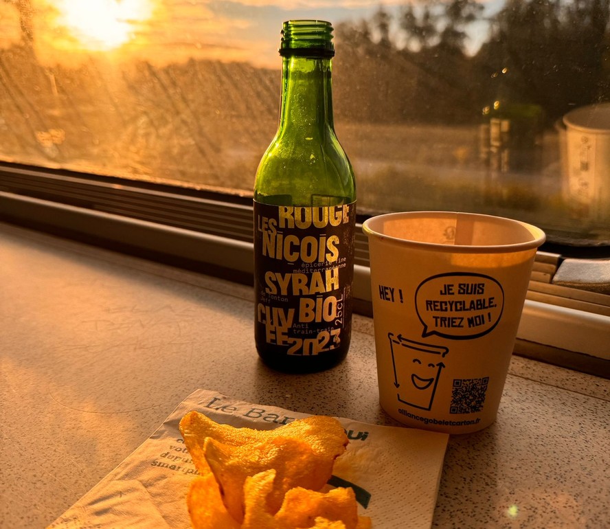 Foram tantas horas de espera que a fome já batia de novo quando peguei meu trem para Bordeaux. Mal saiu da estação,eu já estava aboletada em uma banqueta do vagão-bar. Taí outra coisa que amo na França: a SCNF,estatal que opera a rede ferroviária e manda muito bem no quesito comes e bebes. Quase tudo é made in France e relativamente saudável em seus fast-foods — da água com gás dos Pirineus ao arroz-doce.