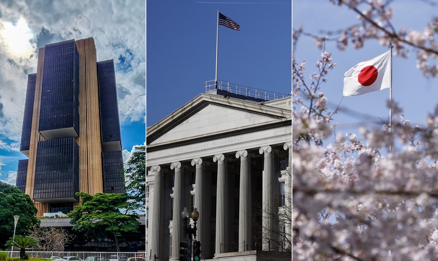 Bancos centrais do Brasil,EUA e Japão — Foto: Agência Brasil e Bloomberg RESUMOSem tempo? Ferramenta de IA resume para você