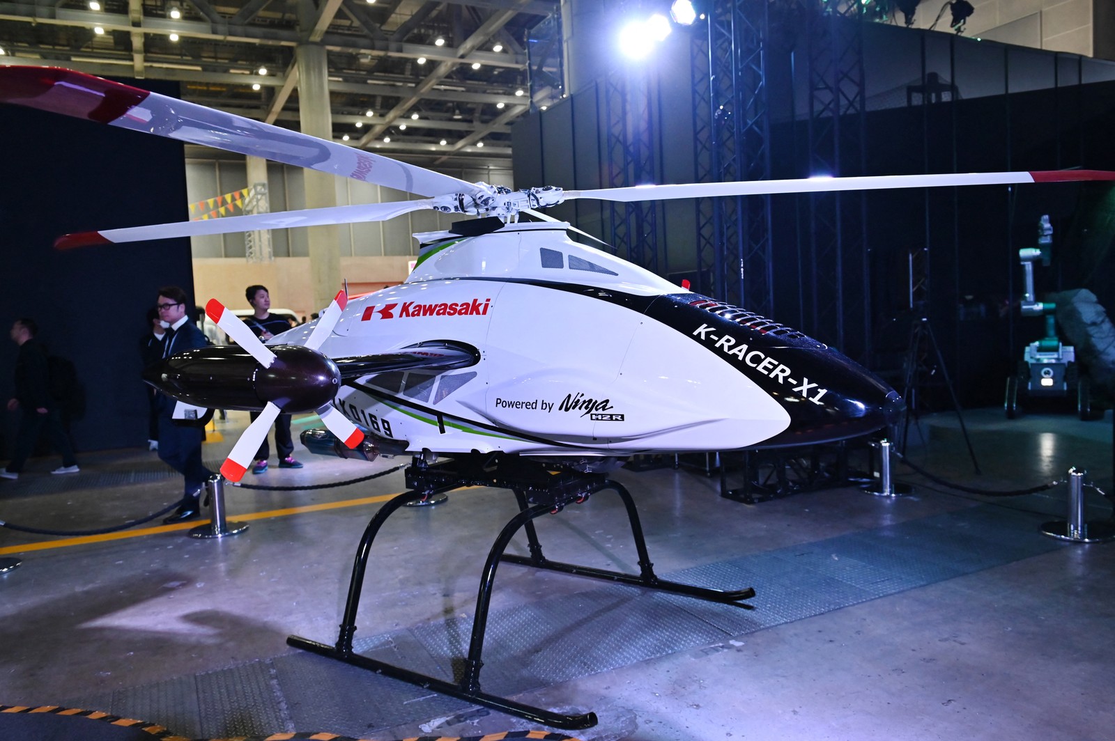 K-RACER-X1,uma aeronave não tripulada de decolagem e pouso vertical (VTOL) de médio porte desenvolvida pela Kawasaki Heavy Industries,em exibição na zona de emergência e mobilidade do Japan Mobility Show em Tóquio — Foto: KAZUHIRO NOGI / AFP