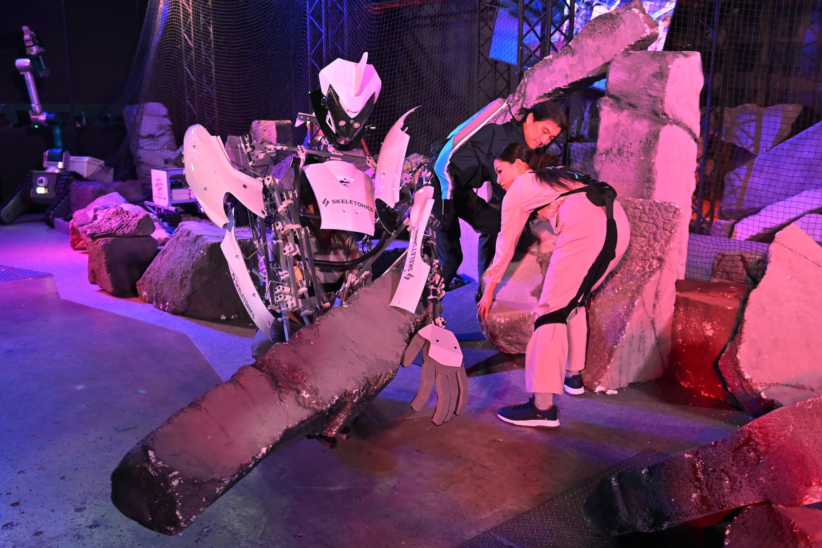 Homem veste o 'Skeletonics',e move obstáculos durante uma demonstração no Japan Mobility Show em Tóquio — Foto: KAZUHIRO NOGI / AFP