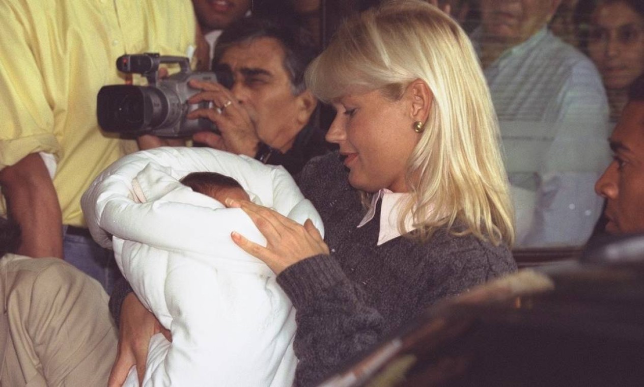 Xuxa deixa a maternidade com a filha,Sasha,em julho de 1998 — Foto: Marcelo Carnaval / Agência O Globo