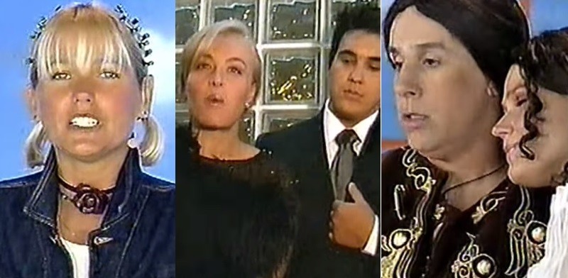 Xuxa abraçada por paquitas no especial de 20 anos da Globo,no fim dos anos 90 — Foto: Reprodução/TV Globo