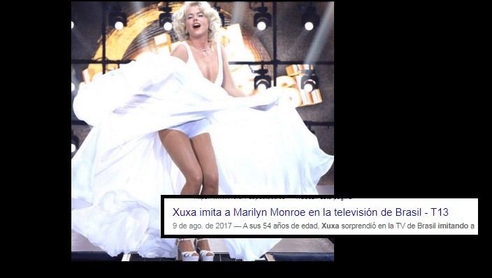 Xuxa imitou Marilyn Monroe em 2017 no 'Dancing Brasil',da Record,e foi notícia em sites de língua espanhola. A apresentadora tem milhares de fãs na Argentina — Foto: Divulgação/Record e Google