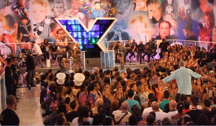Ao completar 50 anos,Xuxa foi surpreendida por um flashmob em sua homenagem no TV Xuxa. Pedro Bial apresentou o programa — Foto: Reprodução/TV Globo