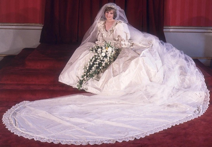 Princesa Diana em seu icônico vestido de casamento,desenhado por David e Elizabeth Emanuel,em julho de 1981. — Foto: Wikimedia