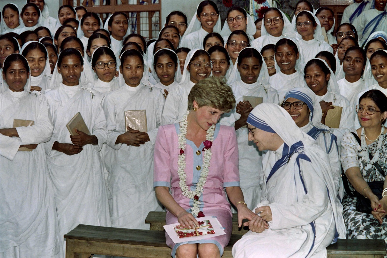 Diana conversa com a irmã Lynne Frederick durante visita a Calcutá — Foto: RAVEENDRAN / AFP