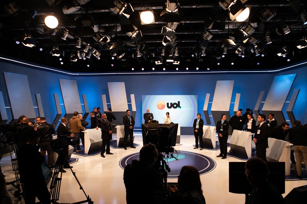 Seguranças em frente ao púlpito de cada candidato no debate da RedeTV/UOL — Foto: Imagem cedida à coluna