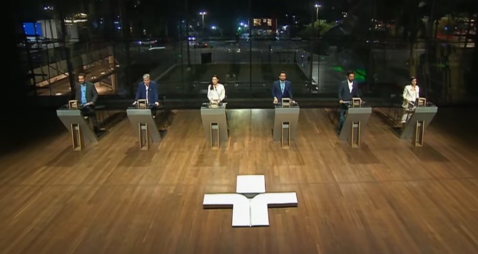Debate da TV Cultura entre candidatos à prefeitura de São Paulo. Na ordem: Guilherme Boulos (PSOL),José Luiz Datena (PSDB),Marina Helena (Novo),Pablo Marçal (PRTB),Ricardo Nunes (MDB) e Tabata Amaral (PSB) — Foto: Reprodução/YouTube