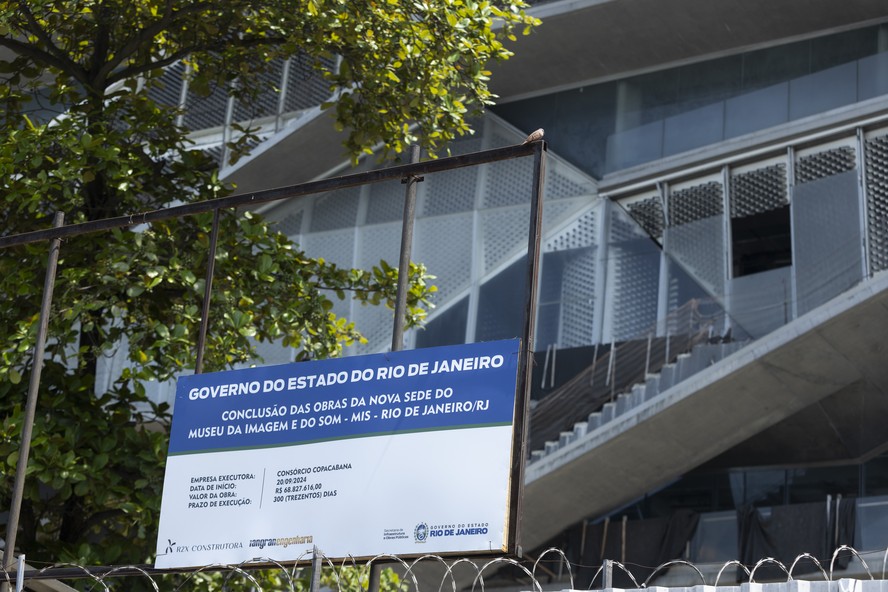 Placa anuncia obras de conclusão da nova sede do MIS — Foto: Márcia Foletto RESUMOSem tempo? Ferramenta de IA resume para você