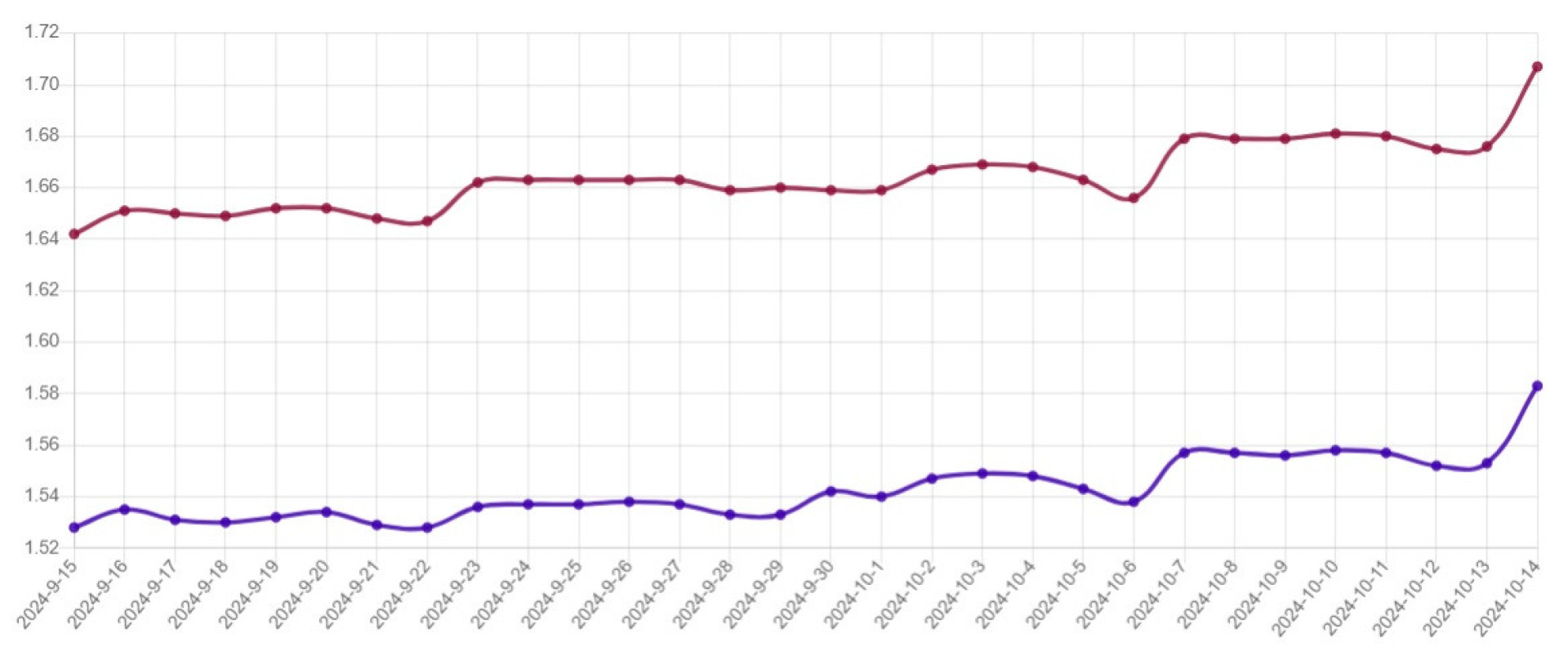 Evolução do preço do gasóleo simples (a azul) e da gasolina simples 95 (a vermelho)© DGEG