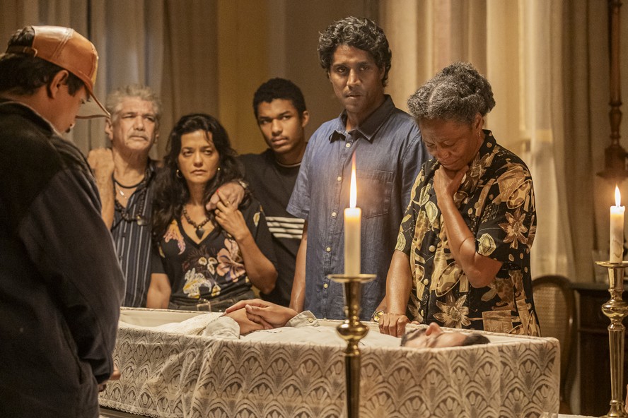EXCLUSIVA COLUNA PLAUY / Xamã,Jackson Antunes,Ana Cecília Costa,Juan Paiva,Breno da Matta e Edvana Carvalho gravam cena do velório de José Venâncio (Rodrigo Simas) — Foto: Léo Rosario/Globo