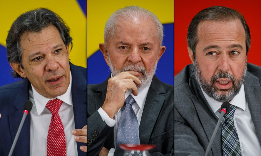 O ministro da Fazenda,Fernando Haddad; o presidente Luiz Inácio Lula da Silva e o ministro de Minas e Energia,Alexandre Silveira,durante cerimônia no Palácio do Planalto em maio — Foto: Fotos de