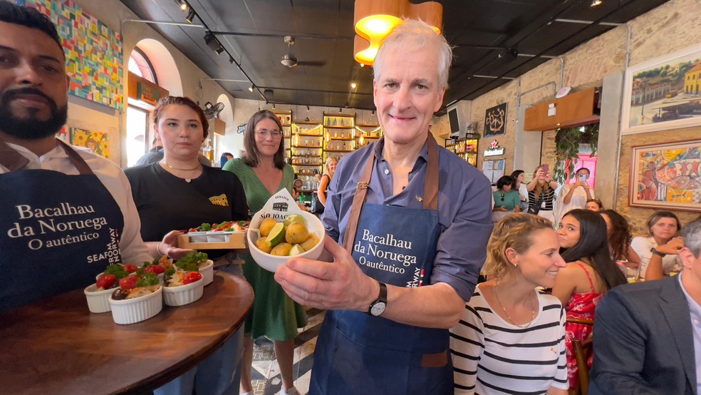 Norwegian Prime Minister Jonas Gahr Støre serves cod fritters in Santa Teresa — Foto: Ana Branco