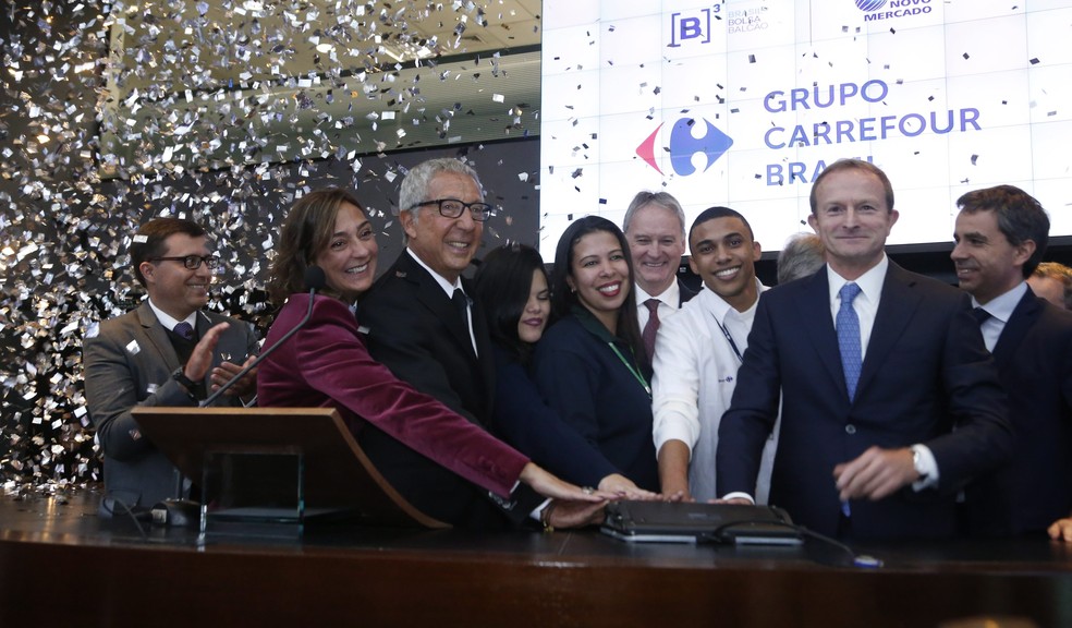 Abilio Diniz entre executivos do Carrefour Brasil na abertura de capital da filial na B3 — Foto: Marcos Alves/ Agência O Globo