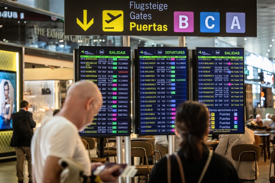 Passageiros observam painel com voos no aeroporto — Foto: Angel Garcia/Bloomberg RESUMOSem tempo? Ferramenta de IA resume para você