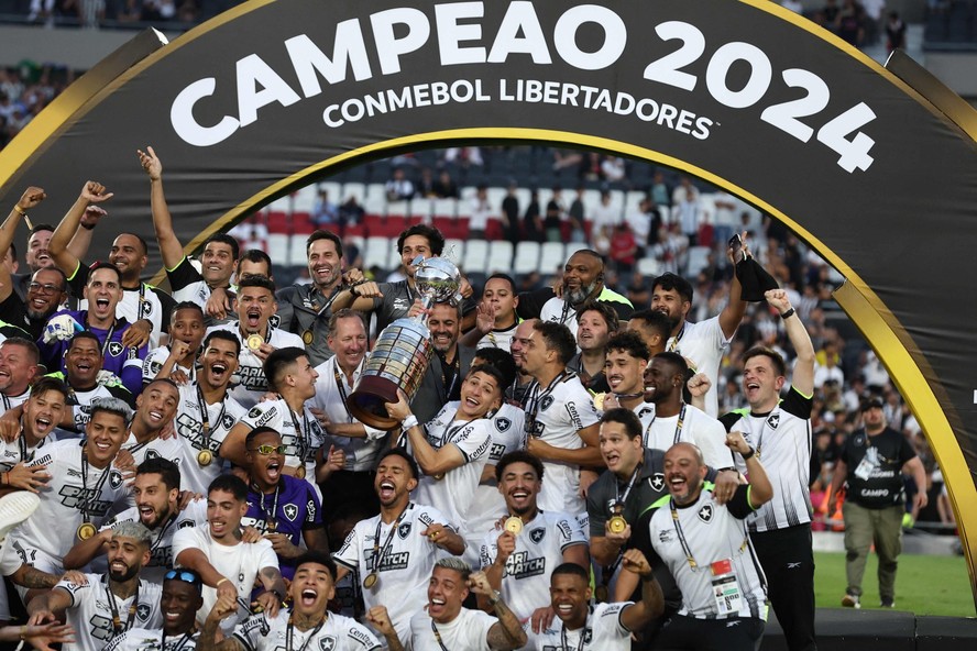 Equipe do Botafogo recebe a taça de campeão da Libertadores — Foto: ALEJANDRO PAGNI / AFP RESUMOSem tempo? Ferramenta de IA resume para você