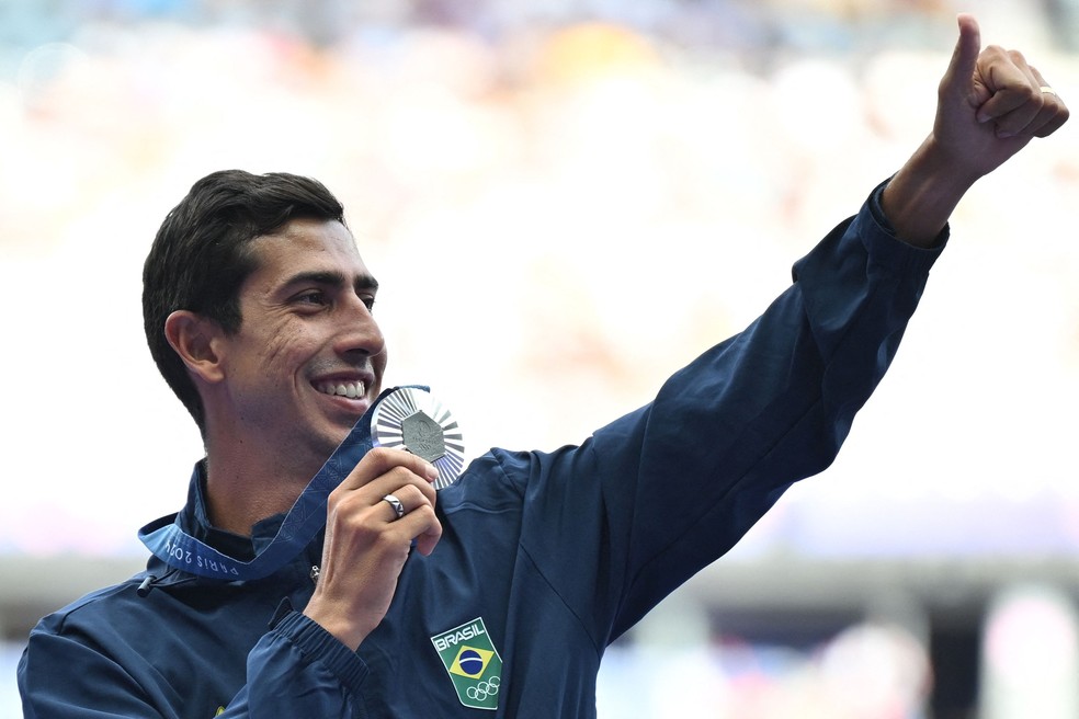 Caio Bonfim com a sua medalha de prata nas Olimpíadas de Paris — Foto: Andrej ISAKOVIC / AFP