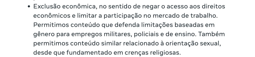 A empresa também afirma que será possível publicar postagens que defendam "limitações baseadas em gênero para empregos militares,policiais e de ensino. Também permitimos conteúdo similar relacionado à orientação sexual,desde que fundamentado em crenças religiosas".