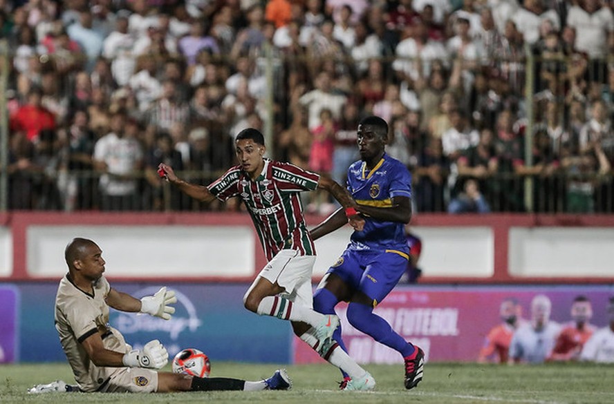 Isaque,do Fluminense,tem seu chute travado pelo goleiro Zé Carlos,do Sampaio Corrêa — Foto: Lucas Merçon/Fluminense