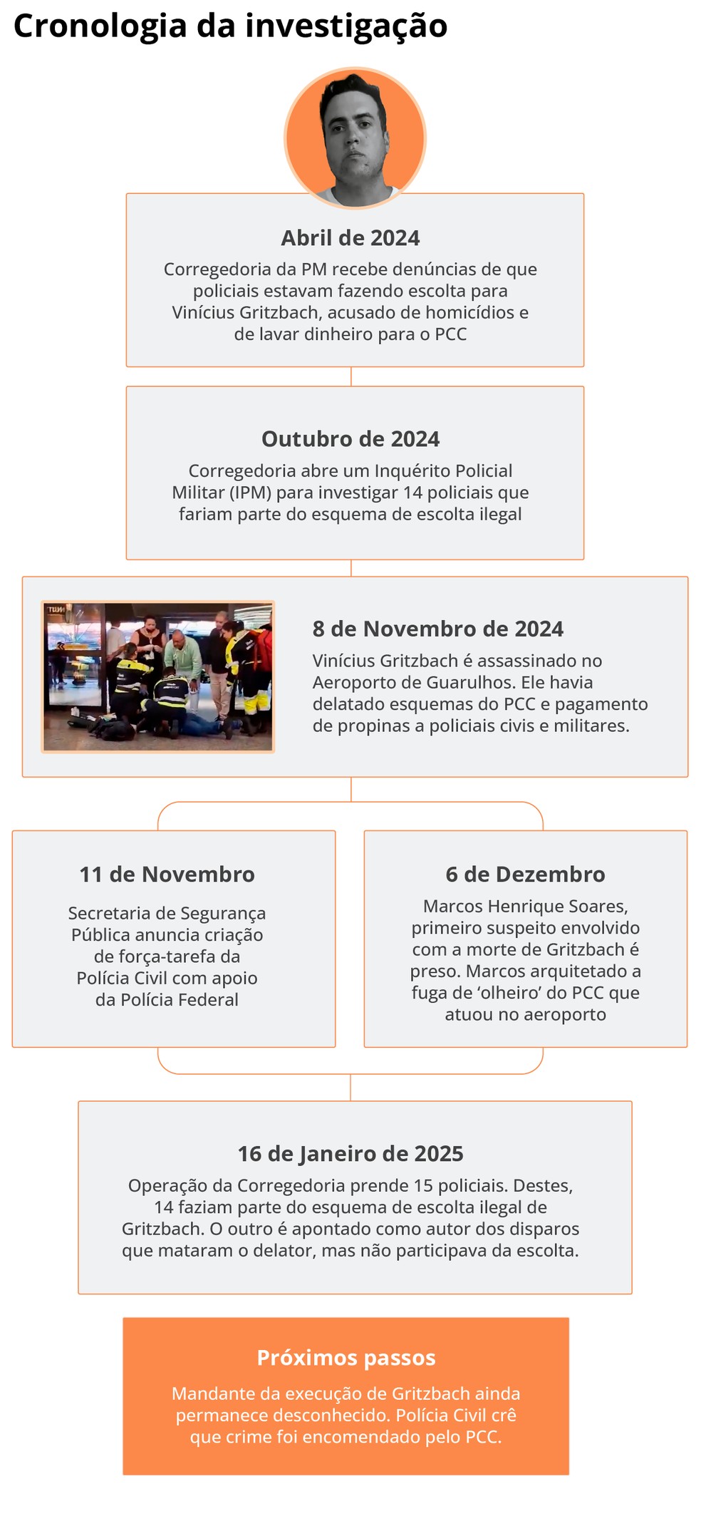 O PM não foi preso pela suspeita de homicídio,e sim por um crime previsto no artigo 150 do Código Penal Militar,o de organização de militares para prática de violência. Isso porque a operação de quinta-feira,denominada Prodotes,foi feita pela Corregedoria,órgão responsável por apurar os desvios de conduta dentro da corporação e crimes militares. A morte de Gritzbach é investigada pela Polícia Civil,mas tudo o que for apurado pela Corregedoria será compartilhado com a corporação. Os depoimentos de presos,os celulares e os documentos apreendidos também serão compartilhados entre os órgãos.
