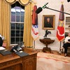 Donald Trump decorou Salão Oval com fotos da família (ao fundo,na imagem) — Foto: Jim WATSON / POOL / AFP