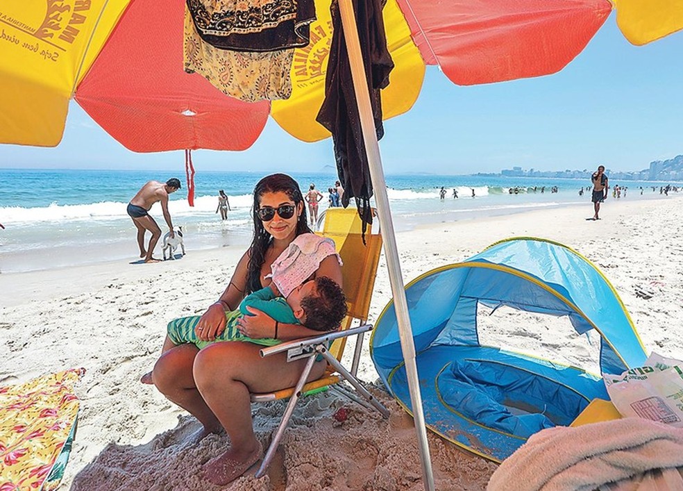 Isabele Ribeiro amamenta o filho sob a barraca,no Leme: “Praias e cachoeiras têm sido os nossos refúgios” — Foto: Agência O Globo / Gabriel de Paiva