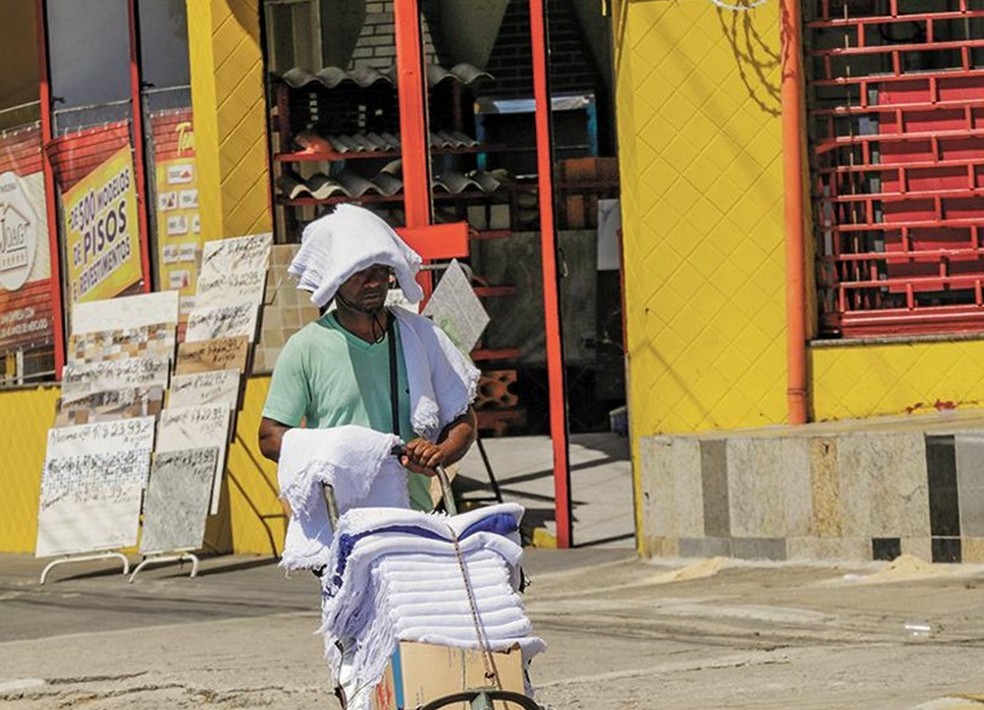 O vendedor dá seu jeito para se proteger do sol,em Madureira — Foto: Agência O Globo / Domingos Peixoto