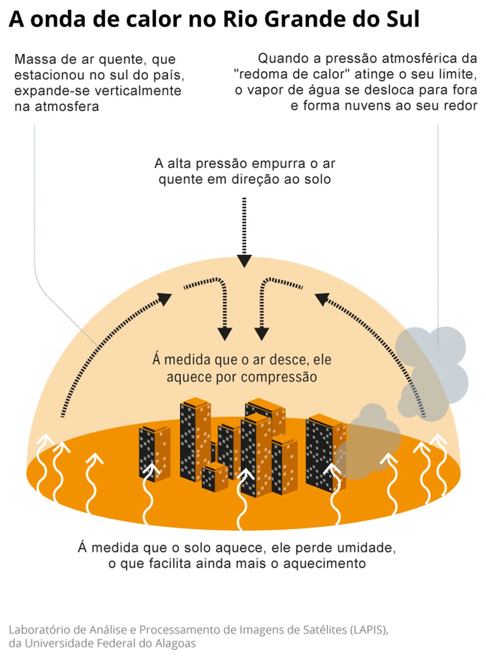 Coordenador do Laboratório de Análise e Processamento de Imagens de Satélites (Lapis),da Universidade Federal do Alagoas,Humberto Barbosa explica que desde o final de janeiro uma redoma de calor (ou bloqueio atmosférico) se instalou no Rio Grande do Sul,o que explica a situação.