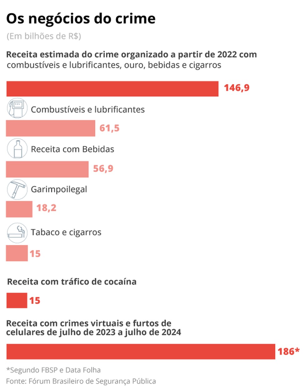 Associado ao tráfico de drogas,o crime organizado no Brasil ganhou R$ 186 bilhões com golpes virtuais e furtos de celulares de julho de 2023 a julho do ano passado,segundo um relatório divulgado na quarta-feira pelo Fórum Brasileiro de Segurança Pública (FBSP). O estudo mostra também que as facções passaram a lucrar mais com atividades comerciais praticadas de forma ilegal,golpes pela internet e furto de celulares. A receita estimada com o comércio paralelo de combustíveis,ouro,cigarro e bebidas em 2022 foi de R$ 147 bilhões,enquanto que a venda de cocaína teria gerado R$ 15 bilhões.