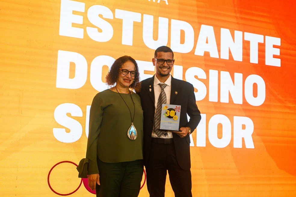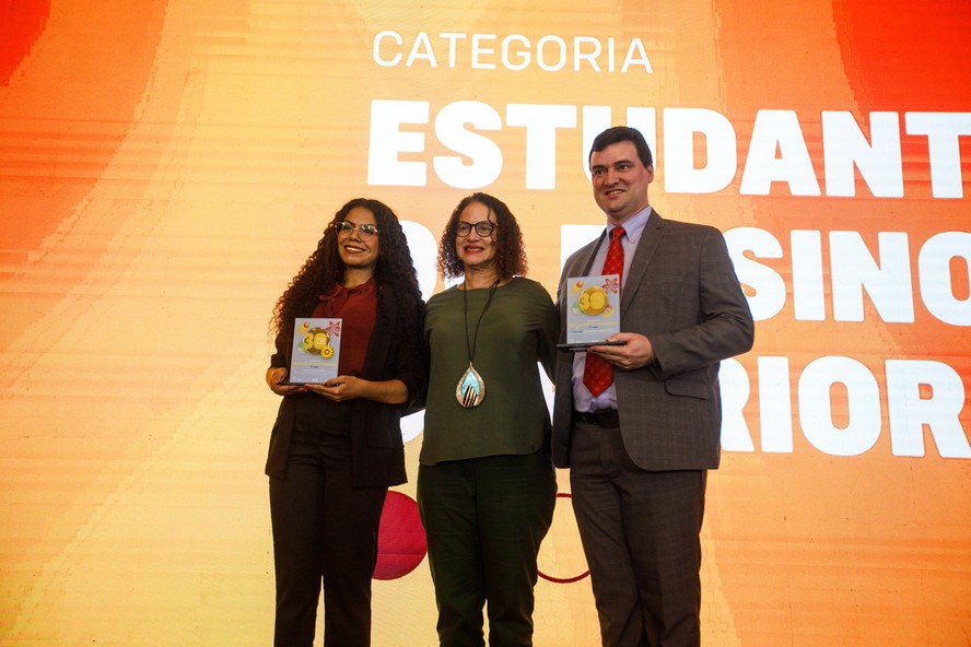À esquerda,o vencedor do 2º lugar na categoria Estudante do Ensino Superior,Samuel Ferreira,com a Ministra da Ciência,Luciana Santos — Foto: Brenno Carvalho
