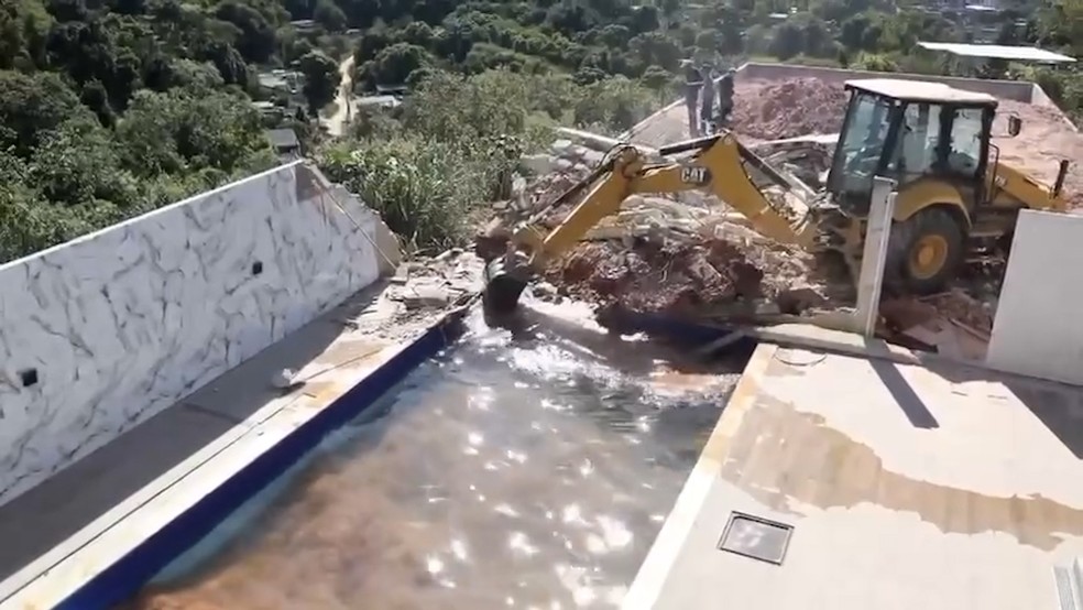 A ação desta segunda-feira ocorreu no Jardim Primavera,também em Caxias,onde a casa estava sendo erguida. A piscina estava cheia e tinha até macarrões,usados por banhistas para flutuarem na água. As paredes da área de lazer também foram derrubadas.