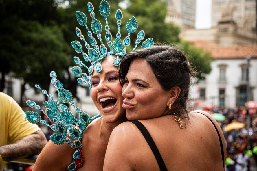 A promoter Carol Sampaio e a atriz Paolla Oliveira no desfile do Bloco da Favorita no carnaval de 2024 no Centro do Rio — Foto: Hermes de Paula / Agência O Globo