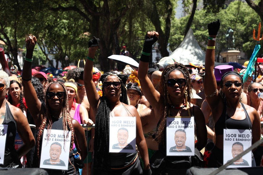 Foliões do bloco Boitatá usam placas em protesto a favor de Igor Melo que foi baleado por PM — Foto: Gustavo Stephan / Riotur