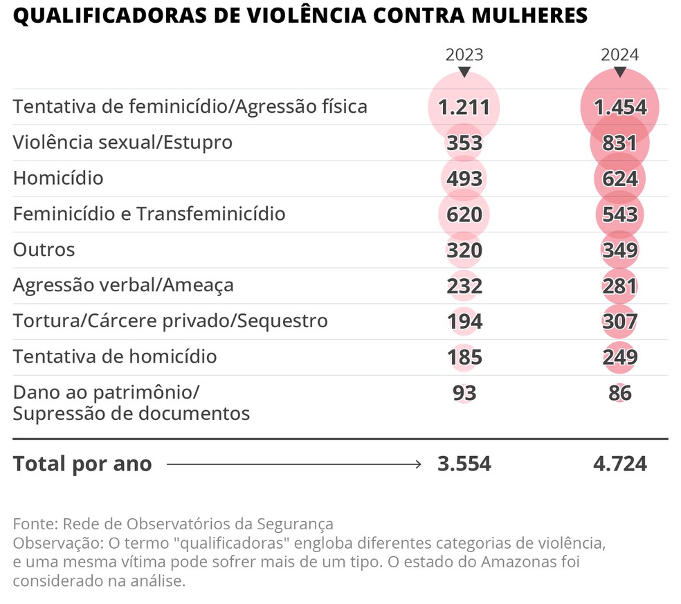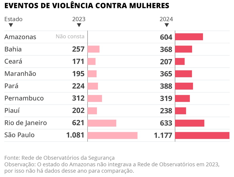 A cada 24 horas,em média,13 mulheres foram vítimas de violência no ano passado nos nove estados monitorados pela Rede de Observatórios da Segurança. Em Amazonas,foram registradas 4.181 mulheres vitimadas,número que representa um aumento de 12,4% em relação a 2023.