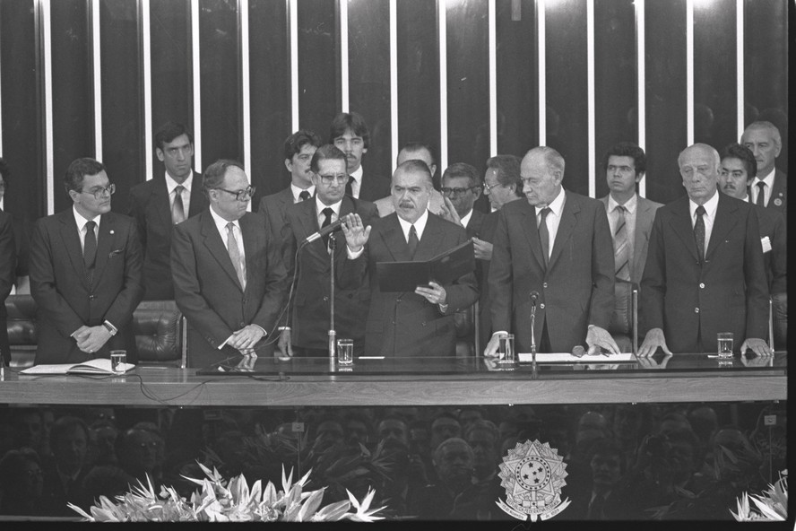 Sarney toma posse em cerimônia que não contou com a presença do general Figueiredo — Foto: Sérgio Marques/15.03.1985