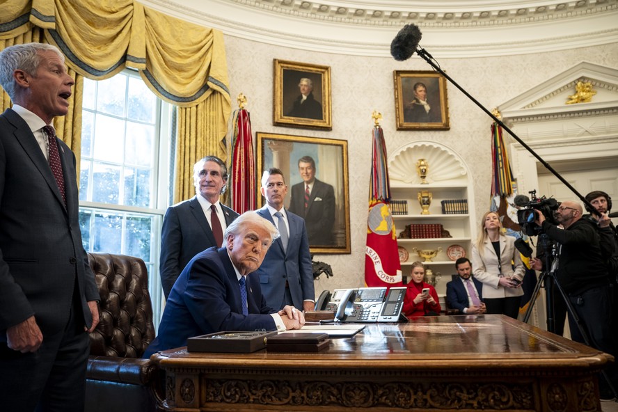 Trump assina ordem executiva suspendendo financiamento federal para escolas e universidades,na Casa Branca — Foto: Haiyun Jiang/The New York Times